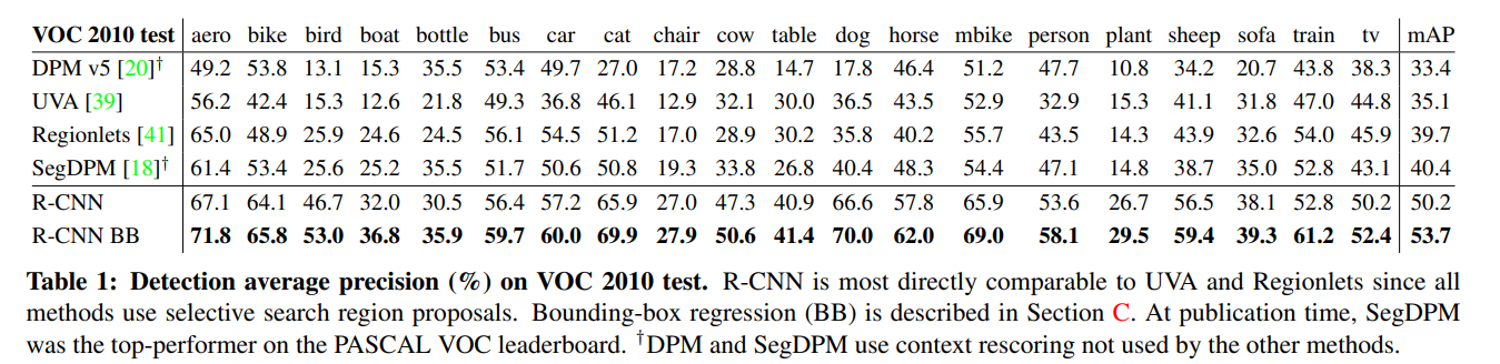 PASCAL VOC dataset에 대한 Object detection 성능은 지난 몇년간 정체되어 있었으며, 기존 최고 성능의 모델은 여러 저수준 특징(SIFT, HOG 등)을 결합하고 고수준 정보(Context)를 활용한 복잡한 앙상블 시스템(Deformable Part Models)이었다.