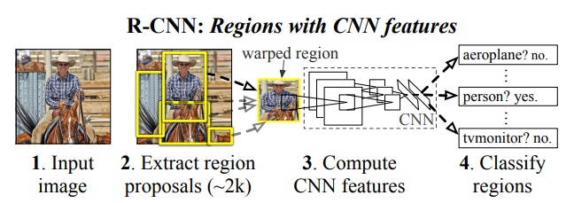 본 논문에서는 CNN Loclization Problem을 "recognition using regions"를 통해 해결한다. 테스트 과정에서 다음과 같은 순서를 기반으로 region proposals를 CNNs와 결합하여 Localization Problem을 해결하였기에, 이를 R-CNN(Regions with CNN features)라 칭한다.